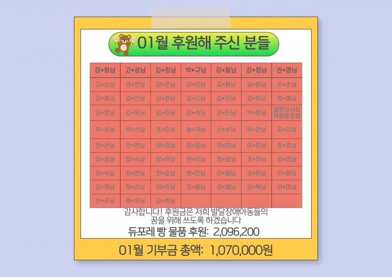 2026년 1월 기부금 현황 페이지 정보 작성자 관리자 조회 10회 작성일 26-04-16 16:14 목록 본문 이전글2026년 2월 기부금 현황 26.04.16 다음글2025년 후원금 사용 내역 26.01.02